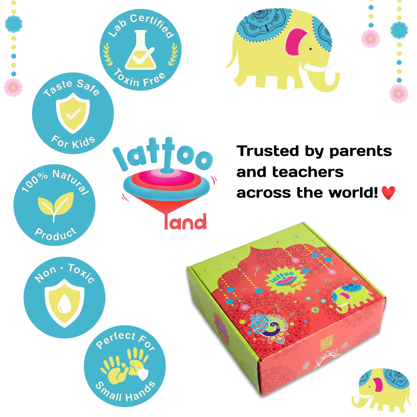 A: Our Rangoli Powders are made of natural and food grade ingredients and specially designed to provide a safe and enjoyable play experience. The Rangoli powders in the Timeless Rangoli Kit are taste-safe and non-toxic.